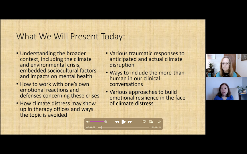 This is an introduction to the field of climate-aware psychotherapy. It covers basic facts about the climate and environmental crisis and the many and varied mental health impacts of these crises. It also describes how psychotherapists can approach the topic of the climate crisis when their clients bring this subject into therapy.